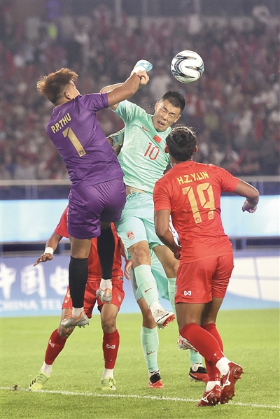 本报讯(文/记者 王斐帆 摄/陈中秋)昨晚7点半,杭州亚运会男足小组赛第二轮迎来一场焦点赛事:A组的中国男足亚运队对阵缅甸队,由于在9月19日的小组赛第一轮比赛中,两队分别以5:1和1:0的比分战胜印度队和孟加拉国队,各积3分位列小组前两位,因此这场比赛的胜者将积6分提前一轮小组出线。