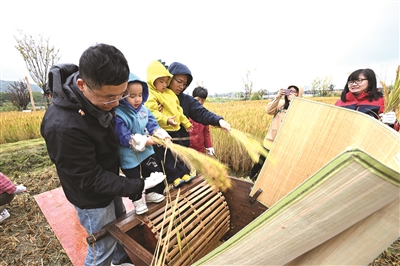 深秋时节,在衙前镇明华村九曲湖农田,游客携孩童一起割稻打谷,体验收获的乐趣,共赏西小江美景。