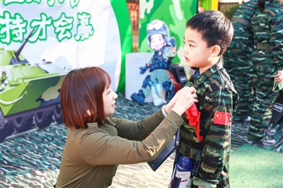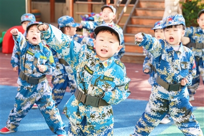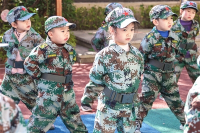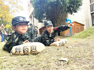 9个班级,268个孩子,听到教官一声又一声响亮而有力的口号声,立马化身成小小兵。他们身穿迷彩服,头戴小军帽,勇敢地进行军体游戏的训练,过独木桥、爬草地、扫地雷……在完成一系列重要任务后,他们来到战场,和老师、家长分工合作,上演最激烈的城市作战。