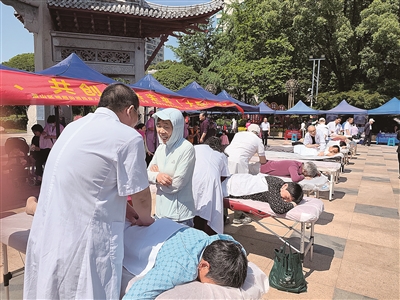 李兴梅20多岁时眼睛失明,后来就学起了推拿。如今她与丈夫两人开了一家推拿店,生意还不错。“我今天早上6点多就从老家赶来了。每年这个时候,盲协都会组织一次大型公益活动,我和老公轮流来参加。平时我们得到过不少好心人的帮助,这次可以用自己的技能回馈社会,帮助别人,内心很自豪,也很开心。”李兴梅爽朗地说。在为市民推拿时,她还会根据个人情况给出专业建议,如平时通过适量运动保持腰椎柔韧度等。