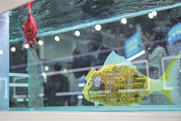 图为5月14日,参观者在2025世界数字教育大会教育数字化成果展上参观智能仿生鱼。
