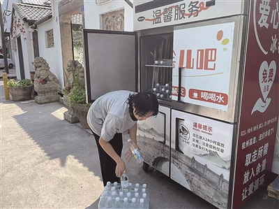 如今,宋丙伟的小院不仅是一个取水点,更是一个可以让人们“歇会儿吧”的温馨场所。这里提供了冷饮、休憩椅和免费WiFi等,成了快递小哥、货车司机和环卫工人等户外工作者的共享小院。爱心冰箱里的饮料不断减少,但总有更多新的补充进来。小院的门始终敞开,欢声笑语也不断传出……
