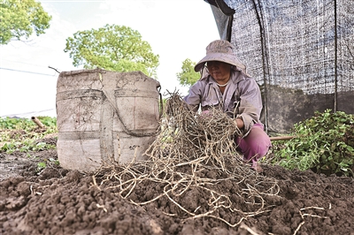 本报讯(记者 何可人 通讯员 周介媛)昨日上午10时许,益农镇三围村的折耳根(鱼腥草)种植基地里,5个移动采摘棚错落分布在田垄间,9名工人正忙着采收。“先铲叶再松土,拔的时候得顺着根须走!”一位大姐手持三齿耙,铁齿插入土中轻轻一撬,白胖的地下茎便裹着泥土潮气露出来,抖净泥沙后丢进篮筐,动作一气呵成。
