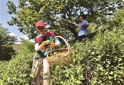 在所前镇李家村的山间栗林里,一串串裹着尖刺的板栗球挂满枝头。连日来,村里的农户们手持长竹竿,穿梭在栗林间,奏响了秋日里的丰收乐章。