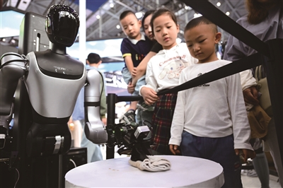 图为9月21日,小朋友在2025世界制造业大会智能机器人展区参观一款会擦桌子的机器人。