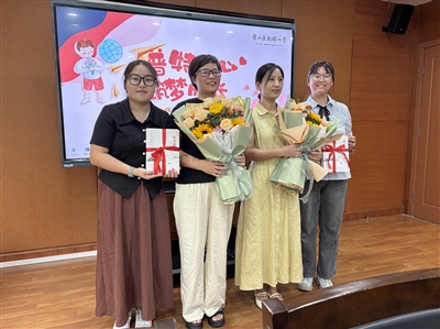 “师徒结对”是启动仪式的核心。现场,两组跨校师徒在大家的掌声中正式结对。徒弟刘多老师与师傅金月老师,徒弟刘思雨老师与师傅黄佳娜老师,一起走到台前。朝晖小学副校长曾萍为两位师傅颁发聘书。两位徒弟向师傅献上鲜花,两位师傅为徒弟赠送书籍。鲜花传递敬意,书籍承载期许,诠释着“传帮带”的教育温情。