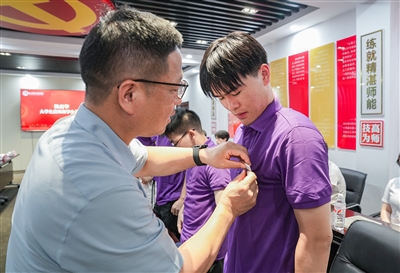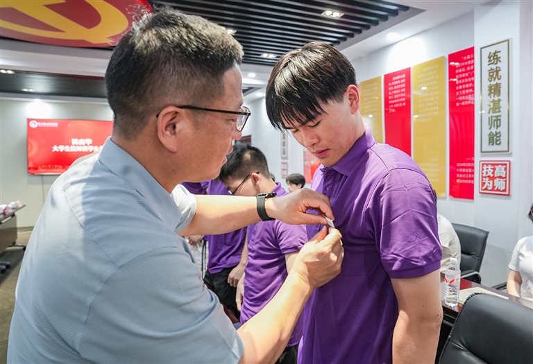 随后,校领导为大学生技师班学生佩戴校徽。这不仅是身份的象征,更代表着技术技能的传承、工匠精神的传承。
